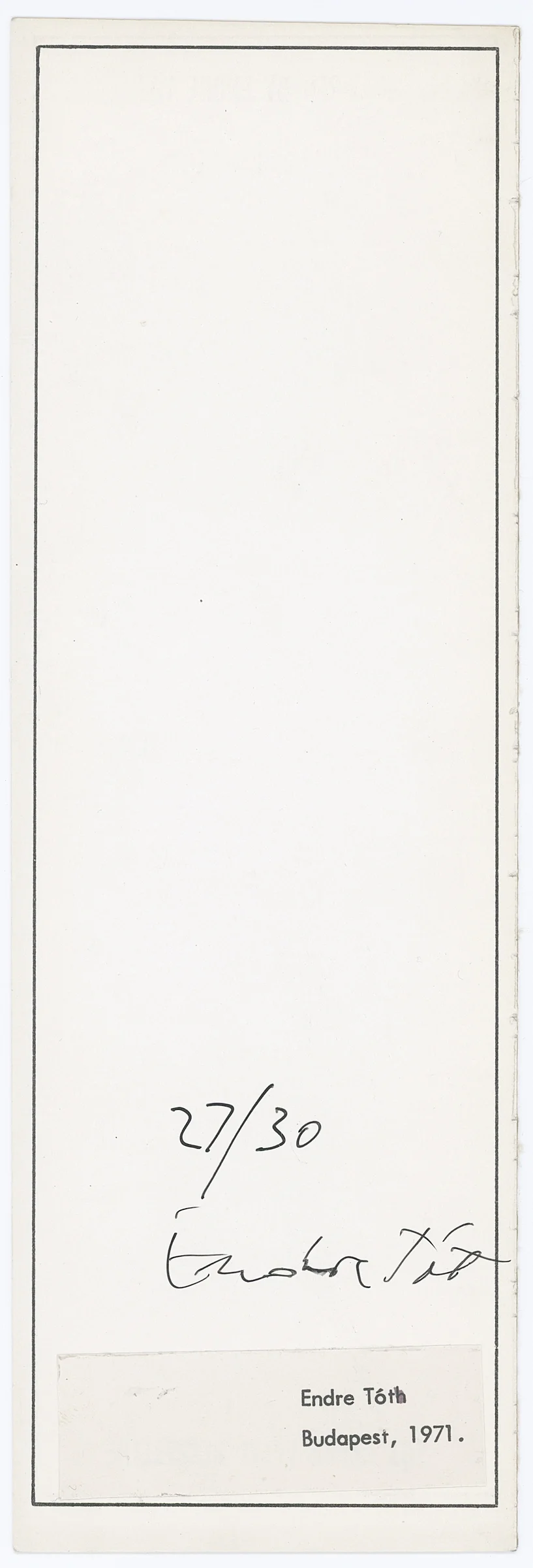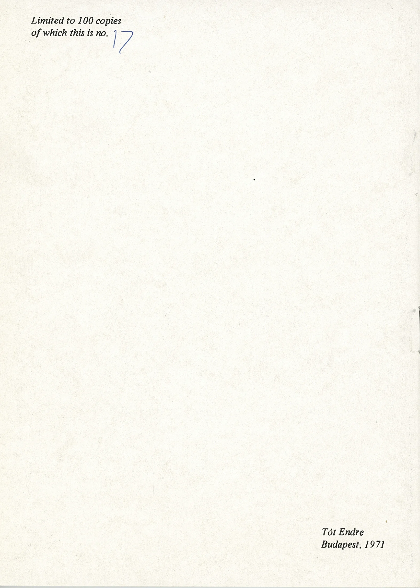 In our copy: the back cover is signed and numbered 27/30 in black pen. A label is affixed at the bottom, with the typewritten inscription "Endre Tóth", where the final "h" has been covered with a marker. The label covers the following inscription (visible only when held against the light): "ENDRE TÓT ÁLTAL PECSÉTELVE" (STAMPED BY ENDRE TÓT).