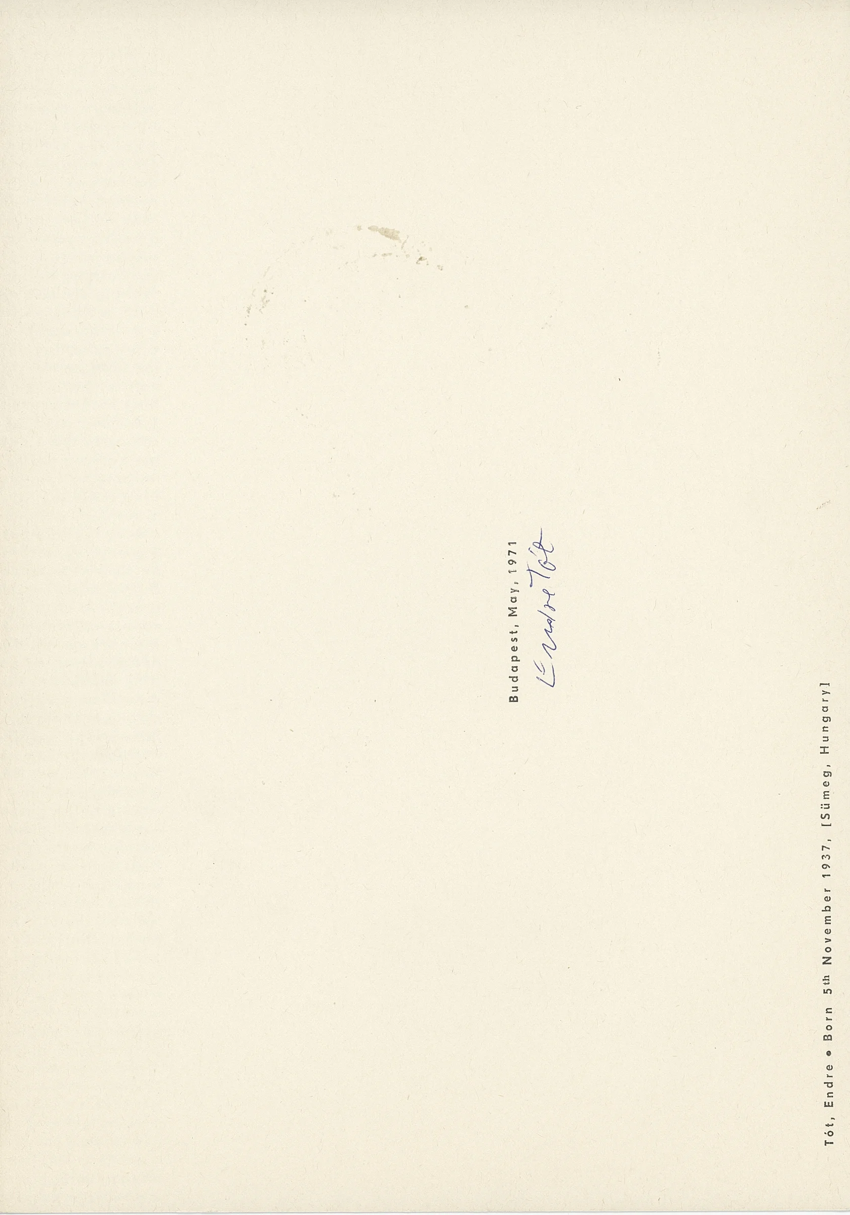 The number of copies published is unknown (Endre Tót estimates a few dozen copies). Signed on the back by Endre Tót in blue pen. The layout is vertical.