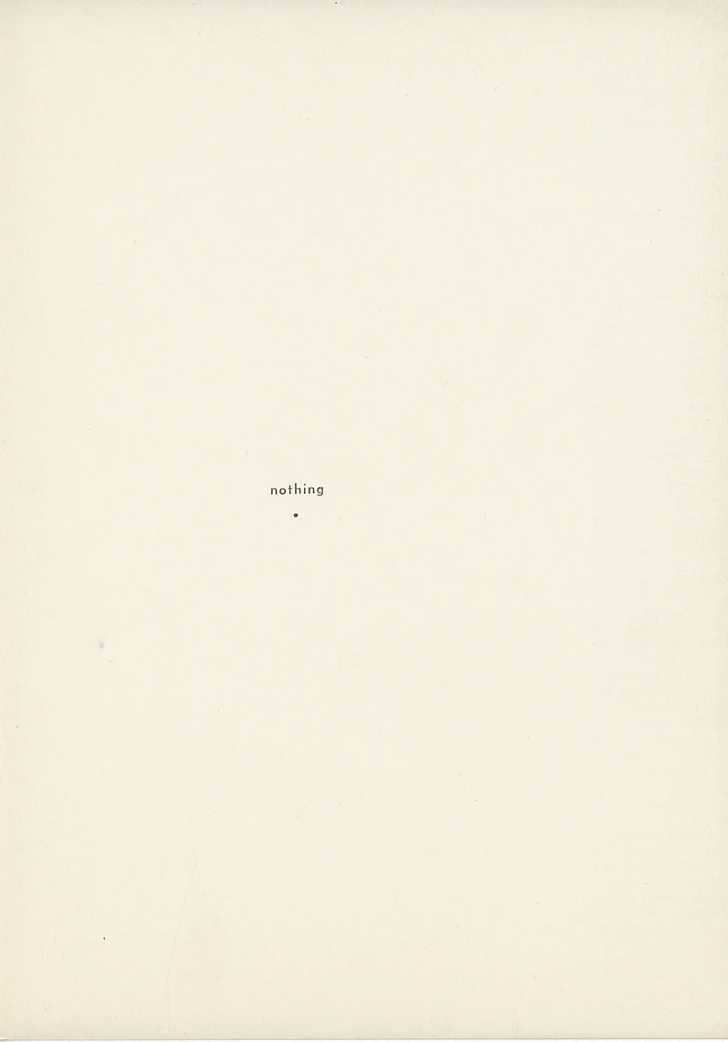 The front cover is titled “nothing” in lowercase letters. Below the title, there is a black dot. On the reverse side of the first and second panels, along their outer margins, there are two screen-printed text bands (50 mm wide and 297 mm long), where the word “nothing” is repeated from top to bottom. The text on the fourth page is printed horizontally. It reads: “Budapest, May, 1971”, and further down, “Endre Tót . Born in 1937. Sümeg, Hungary”.