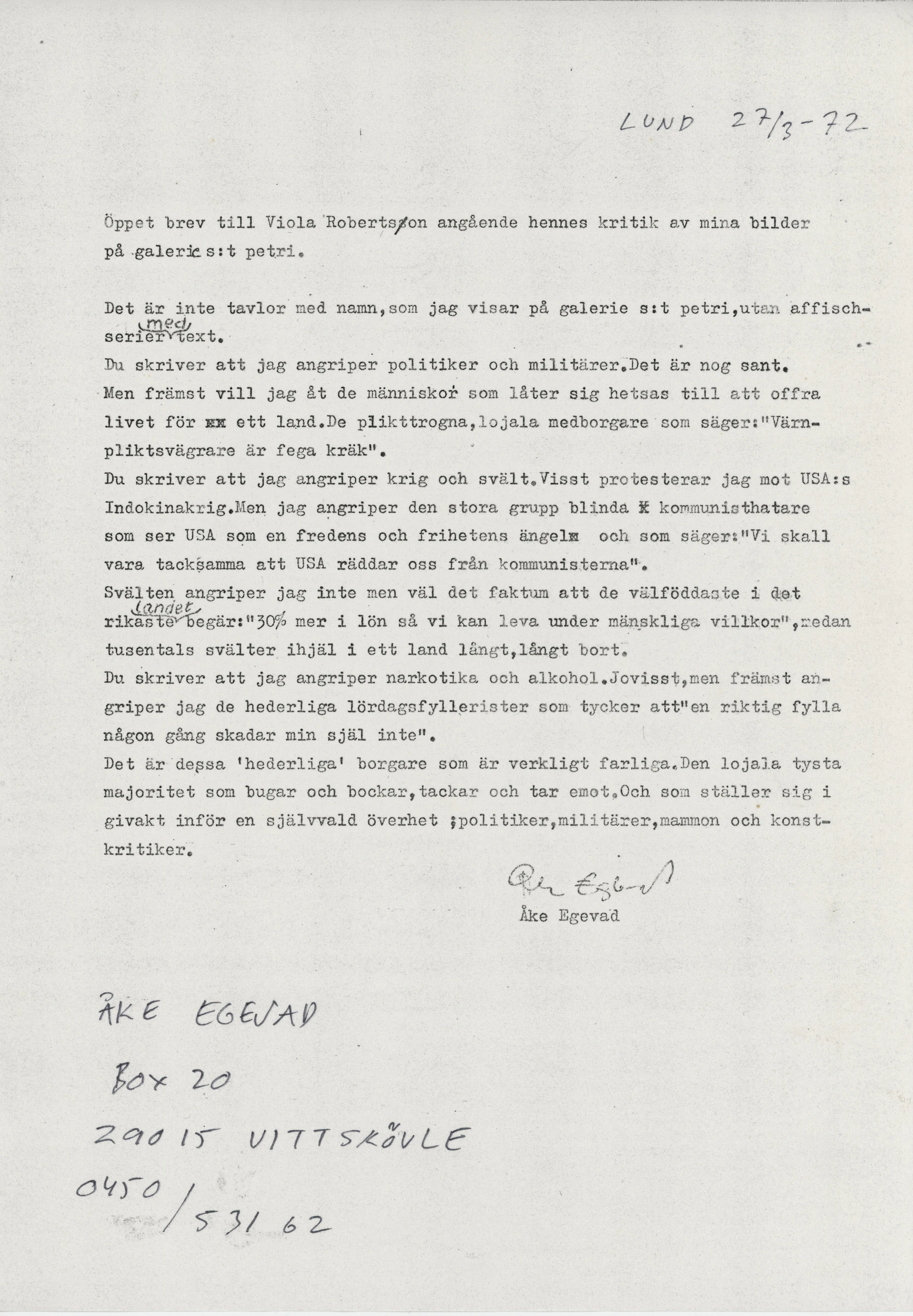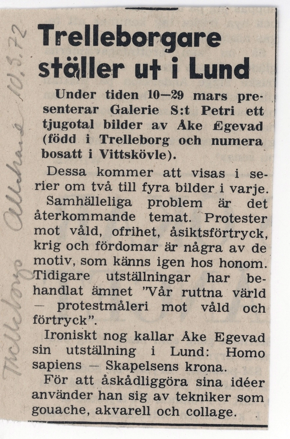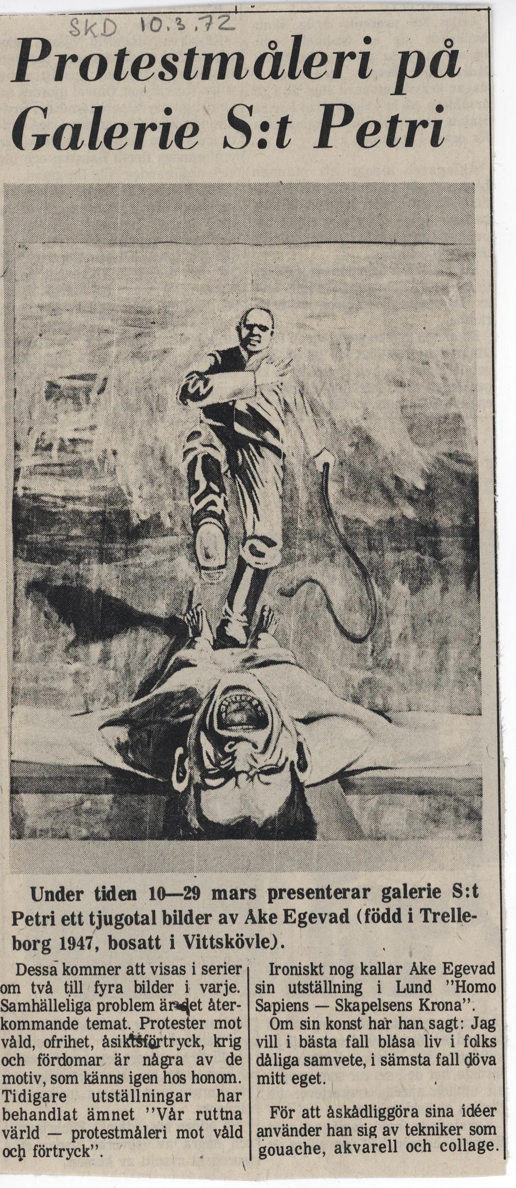 [JEANSELLEM VIEWER] — 10-29.03.1972 ÅKE EGEVAD — Categories: press, docs, letters — Keywords: Galerie S:t Petri, Jean Sellem, archive — Category: press — Trelleborgs Allehanda, 10 March 1972 (handwritten pencil annotation: “Trelleborgs Allehanda”) — An artist from Trelleborg exhibits in Lund.From 10 to 29 March, Gallery S:t Petri presents around twenty images by Åke Egevad (born in Trelleborg and now residing in Vittskøvle). These are shown in series of two to four images each. Social issues constitute the recurring theme. Protests against violence, lack of freedom, suppression of opinions, war, and prejudice are among the motifs that can be recognized in his work. Earlier exhibitions have dealt with the subject “Our rotten world – protest painting against violence and oppression.” Ironically, Åke Egevad titles his exhibition in Lund: Homo sapiens – the crown of creation. In order to visualize his ideas, he employs techniques such as gouache, watercolor, and collage. — — — Category: press — Arbetet, 18 March 1972 (handwritten pencil annotation: “18.3.72”) — Gallery S:t Petri, S:t Petri kyrkogata 5, open Monday–Friday 3–8 p.m., Saturday–Sunday 12–5 p.m. Åke Egevad works as a manual laborer for three months of the year; during the other months he makes images in order to “in the best case revive people’s bad conscience, in the worst case numb my own.” These are images dealing with imperialism in the world and fascism here and there. “Western cultural disseminator” is a skull; the person was killed by bullets that shot the words “we want peace US Army” into the forehead. Around it stand Coca-Cola bottles bearing the American flag: an altar of death. “… and they put boots on their feet” deals with the small law-and-order generals who crawled forward some time ago, when Arrabal’s play “They put handcuffs on the flowers” was to be staged at the Malmö City Theatre. In the center, Sven Stolpe raises his arm in a well-known manner; beside him stands Aron Borelius. On Saturdays at 6 p.m., the gallery hosts evenings of various kinds. Today: “German political poetry after 1945” – reading by Bernhard Modes. — — — Category: press — Skånska Dagbladet, 10 March 1972 (handwritten pencil annotation: “SkD 10.3.72”) — Protest painting at Gallery S:t Petri. From 10 to 29 March, Gallery S:t Petri presents around twenty images by Åke Egevad (born in Trelleborg in 1947, residing in Vittskövle). These are shown in series of two to four images each. Social issues constitute the recurring theme. Protests against violence, lack of freedom, suppression of opinions, war, and prejudice are among the motifs recognizable in his work. Earlier exhibitions have addressed the subject “Our rotten world – protest painting against violence and oppression.” Ironically, Åke Egevad titles his exhibition in Lund “Homo sapiens – the crown of creation.” About his art he has said: I want, in the best case, to revive people’s bad conscience, in the worst case to numb my own. To visualize his ideas, he uses techniques such as gouache, watercolor, and collage — — — Category: press — Kristianstadsbladet, 17 March 1972 (handwritten pencil annotation: “Kristianstadsbladet 17.3.72”). Image caption: One of the images from the exhibition "The Crown of Creation". — Vittskövle protest. From 10 to 29 March, Gallery S:t Petri in Lund presents around twenty images by Åke Egevad (born in Trelleborg in 1947, residing in Vittskövle). These are shown in series of two to four images each. Social issues constitute the recurring theme. Protests against violence, lack of freedom, suppression of opinions, war, and prejudice are among the motifs recognizable in his work. Earlier exhibitions have addressed the subject “Our rotten world – protest painting against violence and oppression.” Ironically, Åke Egevad titles his exhibition in Lund Homo sapiens – The Crown of Creation. To visualize his ideas, he uses techniques such as gouache, watercolor, and collage. “In the best case I want to revive people’s bad conscience, in the worst case to numb my own,” he says — — — Category: press — Helsingborgs Dagblad, March 1972 (handwritten pencil annotation: “Helsingborgs Dagblad 11.3.72”) — ARTFrom 10 to 29 March, Gallery S:t Petri in Lund presents around twenty images by Åke Egevad (born in Trelleborg in 1947, residing in Vittskövle). These are shown in series of two to four images each. Social issues constitute the recurring theme. Protests against violence, lack of freedom, suppression of opinions, war, and prejudice are among the motifs recognizable in his work. Earlier exhibitions have dealt with the subject “Our rotten world – protest painting against violence and oppression.” Ironically, Åke Egevad titles his exhibition in Lund: Homo sapiens – the crown of creation. To visualize his ideas, he uses techniques such as gouache, watercolor, and collage. — — — Category: docs — Open letter by Åke Egevad to Viola Robertson, Lund, 27 March 1972. Author’s text responding to a critique of his exhibition at Gallery S:t Petri. — Lund, 27 March 1972.Open letter to Viola Robertson concerning her criticism of my images at Gallery S:t Petri.It is not paintings with titles that I show at Gallery S:t Petri, but poster series with text.You write that I attack politicians and the military. That is probably true. But above all I want to reach the people who allow themselves to be incited into sacrificing their lives for a country. The dutiful, loyal citizens who say: “Conscientious objectors are cowardly scum.”You write that I attack war and famine. Certainly, I protest against the United States’ Indochina war. But I attack the large group of so-called blind anti-communists who see the USA as an angel of peace and freedom and who say: “We should be grateful that the USA saves us from the co