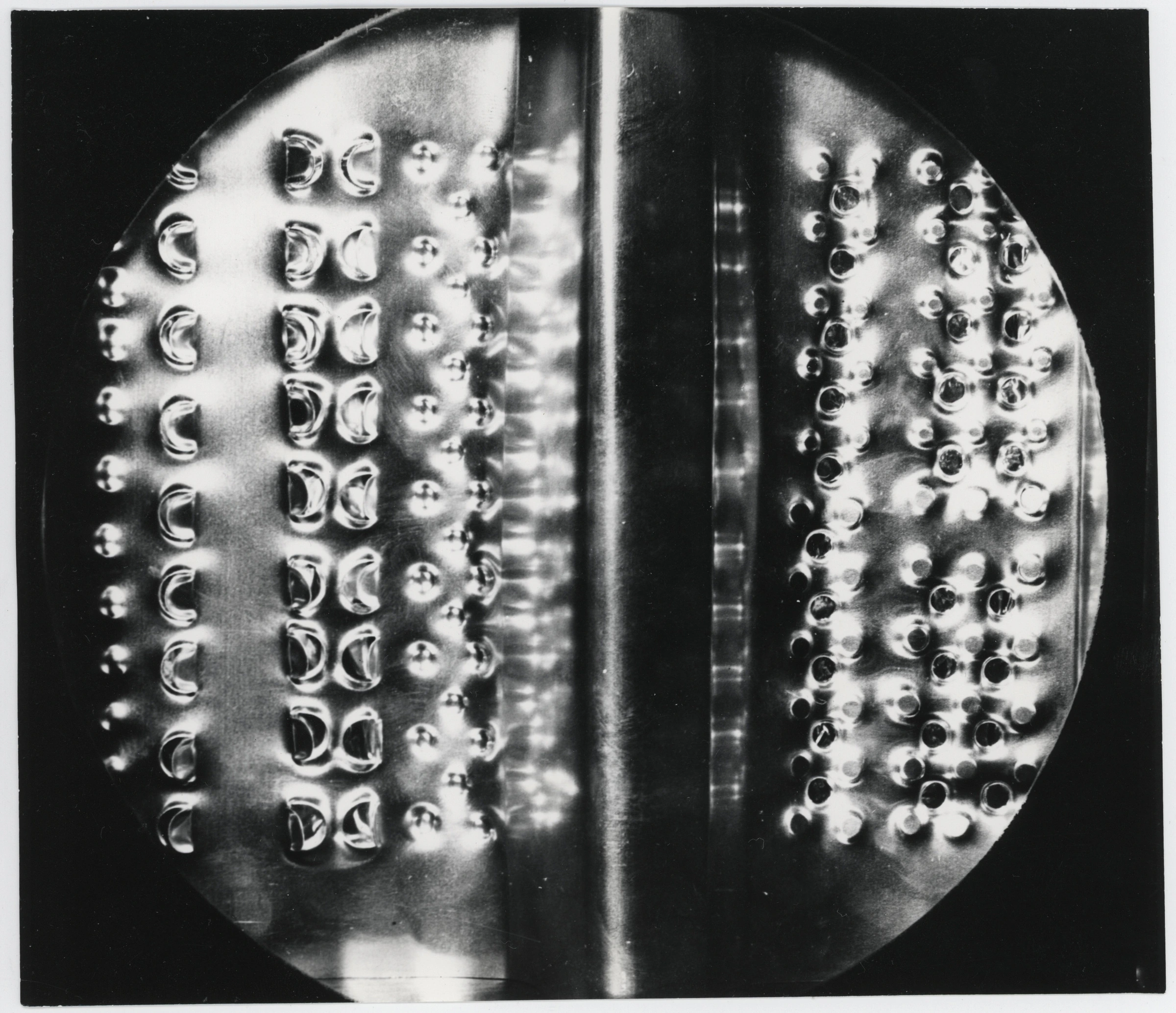 Huber has created his objects out of aluminum, brass, plexiglass, electric lamps. He has been fascinated by the gloss of metal, by light’s reflections in dents and incisions, by the artificial patterns produced by rotating plexiglass plates. Huber wants to teach us the beauty of the world that surrounds us. At the same time, he makes us aware of our growing emptiness, of all that we are on the verge of losing: the fresh air, the living soil, the clear water, human solidarity, community.