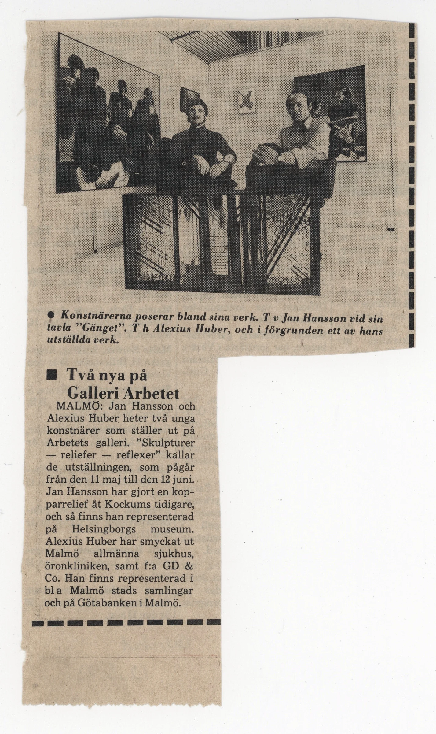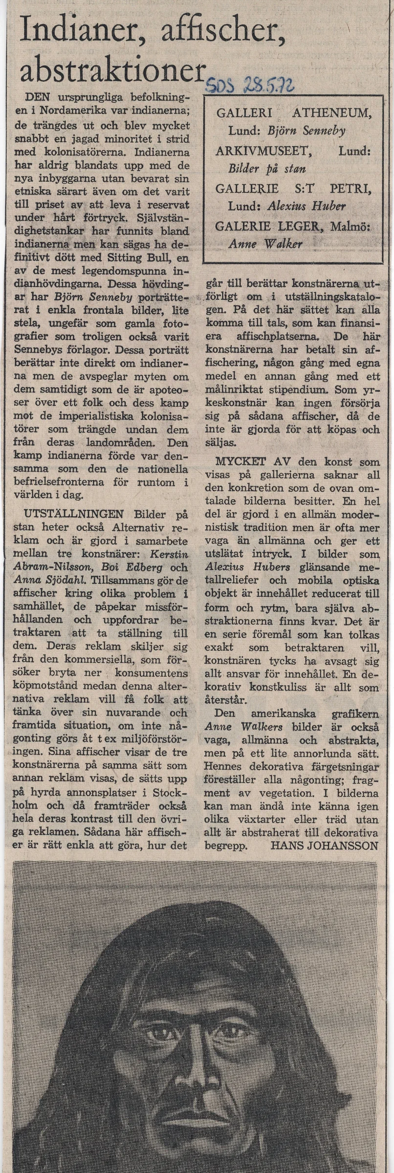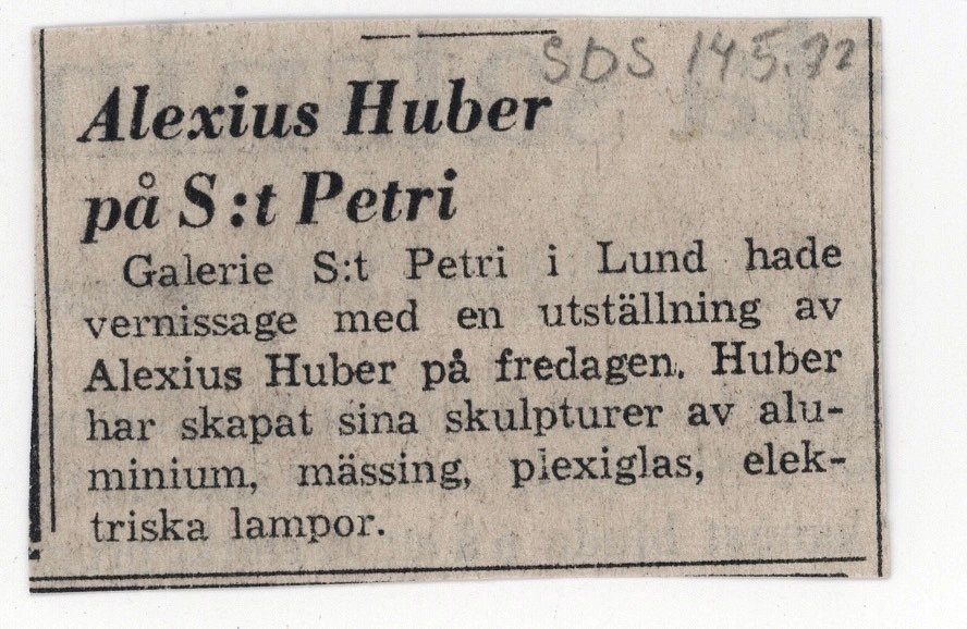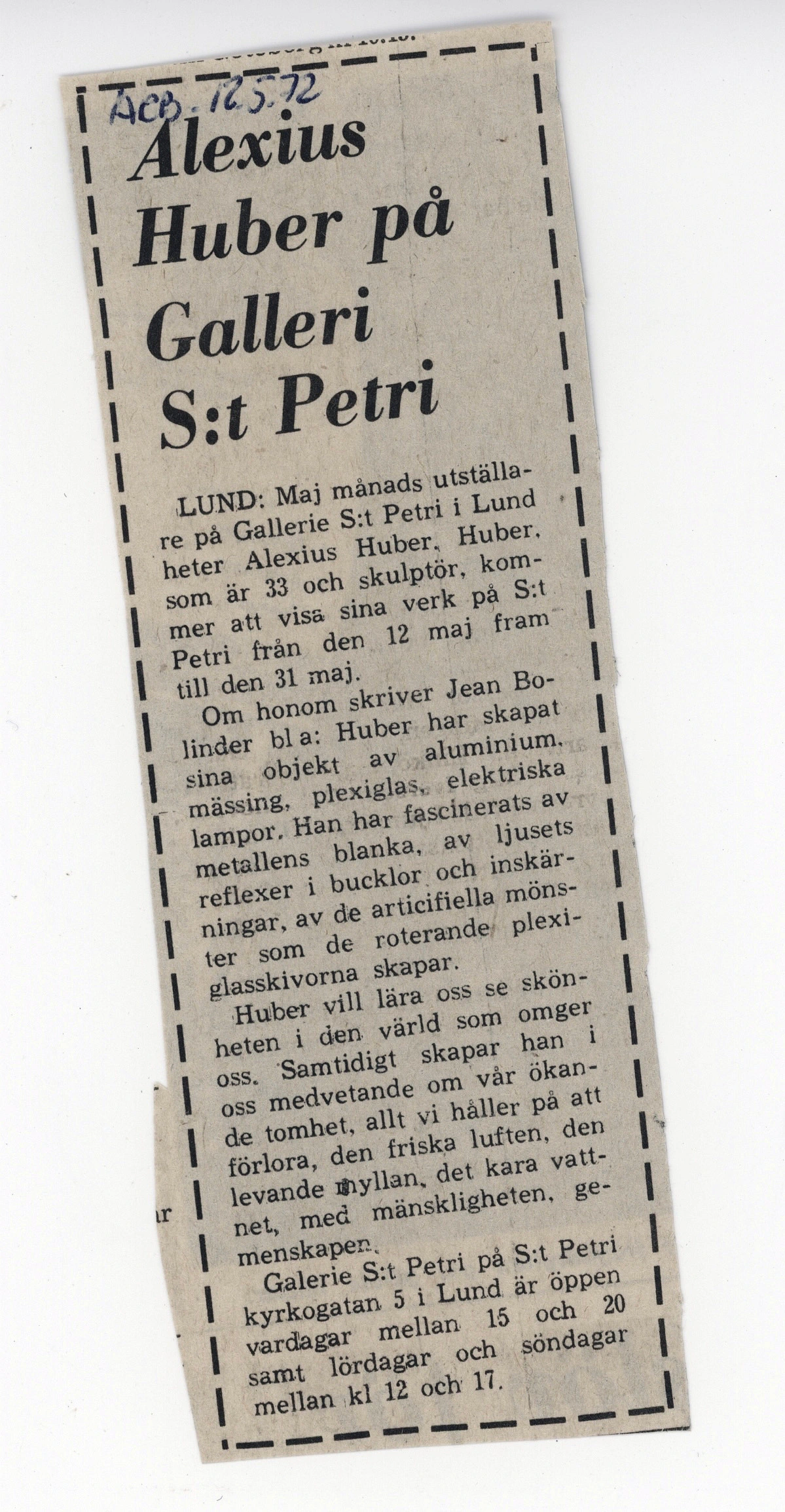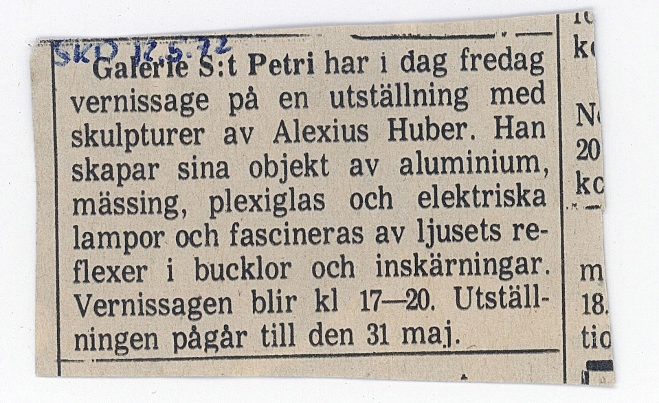 [JEANSELLEM VIEWER] — 21.04 - 10.05.1972 ALEXIUS HUBER — Categories: invitation, press — Keywords: Galerie S:t Petri, Jean Sellem, archive — Category: invitation — Galerie S:t Petri is holding an opening today, Friday, for an exhibition of sculptures by Alexius Huber. He creates his objects from aluminum, brass, plexiglass and electric lamps, and is fascinated by the reflections of light in dents and indentations. The opening runs from 5–8 pm. The exhibition continues until 31 May. — — — Alexius Huber at Galerie S:t PetriLUND: The exhibiting artist for the month of May at Galerie S:t Petri in Lund is Alexius Huber. Huber, who is 33 and a sculptor, will show his works at S:t Petri from 12 May until 31 May.About him, Jean Bolinder writes, among other things: Huber has created his objects from aluminium, brass, plexiglass and electric lamps. He has been fascinated by the sheen of metal, by light’s reflections in dents and incisions, and by the artificial patterns created by rotating plexiglass discs.Huber wants to teach us to see the beauty in the world around us. At the same time, he awakens in us an awareness of our growing emptiness—everything we are in the process of losing: fresh air, living soil, clear water, humanity, community.Galerie S:t Petri, S:t Petri Kyrkogatan 5, Lund, is open weekdays from 15:00 to 20:00, and Saturdays and Sundays from 12:00 to 17:00. — — — Category: invitation — Alexius Huber at S:t PetriGalerie S:t Petri in Lund held an opening on Friday for an exhibition by Alexius Huber. Huber has created his sculptures from aluminium, brass, plexiglass and electric lamps. — — — Caption: “Come to where the flavour is”, by Krister Zarelius (Formuleter). — LUND — GALERIE S:T PETRI (S:t Petri kyrkogata 6)Open Mon–Fri 3–8 pm, Sat–Sun 12–5 pm.Alexius Huber’s sculptures consist of smooth, gleaming metal objects, directly or indirectly drawn, for example, from the levelled sheet-metal dents of car chrome. One might say he has uncovered a formal language that increasingly surrounds us in reality: the language of technocracy and unrestrained faith in progress.But one might object that this is unnecessary: in real life that formal language already pours enough notions over us—and in a more effective, more calculated way. In that sense Huber’s objects become a kind of documentary fragments; fragments because he shows us only the sheen, the formal language—without for a moment suggesting what it is that is being “said” in that language. You don’t hear it; they are mute in their seclusion. — Wednesday is the last day. — — — Category: press — “Portrait of a Native American Chief,” by Björn Senneby. — Indians, posters, abstractionsThe original population of North America was the Indians; they were pushed out and very quickly became a hunted minority in conflict with the colonizers. The Indians never mixed with the new inhabitants but preserved their ethnic distinctiveness, even though this came at the price of living in reservations under harsh oppression. Ideas of independence existed among the Indians but can be said to have died definitively with Sitting Bull, one of the most legendary Native American chiefs. These chiefs have been portrayed by Björn Senneby in simple frontal images, somewhat stiff, resembling the old photographs that likely served as his models. These portraits do not speak directly about Indians, but they reflect their myth while serving as apotheoses of a people and its struggle against the imperialist colonizers who drove them from their lands. The struggle of the Indians was the same as that of the national liberation fronts around the world today.THE EXHIBITION *Bilder på stan* (“Pictures in the City”) is also called *Alternative Advertising* and was created in collaboration between three artists: Kerstin Abram-Nilsson, Boj Edberg and Anna Sjödahl. Together they make posters addressing various social problems, pointing out abuses and urging the viewer to take a stand. Their advertising differs from commercial advertising, which tries to overcome the consumer’s resistance to buying, whereas this alternative advertising wants to make people reflect on their present and future situations, about issues such as environmental destruction. Their posters are displayed in the same way as commercial ones: they are posted on rented billboards in Stockholm, and in that setting their contrast with regular advertising becomes evident. Such posters are fairly easy to make, as the artists explain in detail in the exhibition catalogue. In this way everyone who can finance a billboard slot can have a voice. Sometimes the artists have paid for the posters themselves, other times with the help of grants. As professional artists, none of them can make a living from such posters, since they are not intended to be bought or sold.MUCH of the art shown in galleries lacks the concreteness that the images mentioned above possess. Huber works in a general modernist tradition but is often vaguer than general and leaves a rather flat impression. In Alexius Huber’s gleaming metallic works and mobile optical objects, the content is reduced to form and rhythm, with abstraction itself remaining. It is a series of objects that can be interpreted entirely according to the viewer’s will, as the artist seems to have renounced all responsibility for content. What remains is a kind of decorative craft.The American graphic artist Anne Walker is also vague and general, but in a somewhat different way. Her decorative posters depict various things — fragments of vegetation. Yet one cannot recognize specific species of plants or trees: everything is abstracted into decorative concepts.HANS JOHANSSONGALLERI ATHENEUM, Lund: Björn Senneby ARKIVMUSEET, Lund: *Bilder på stan* GALLERIE S:T PETRI, Lund: Alexius Huber GALERIE LEGER, Malmö: Anne Walker — — — “The artists among their works: Jan Hansson on th