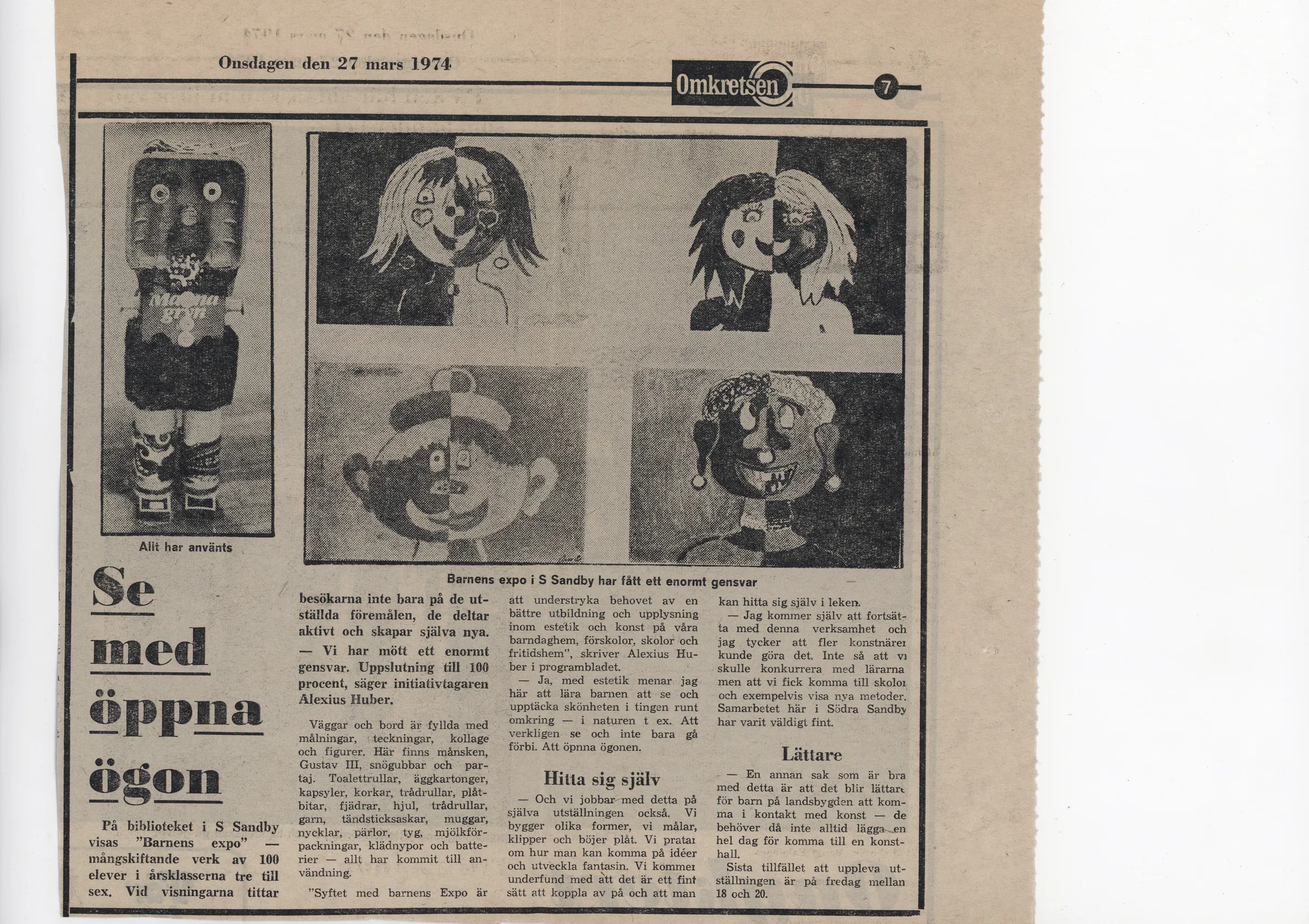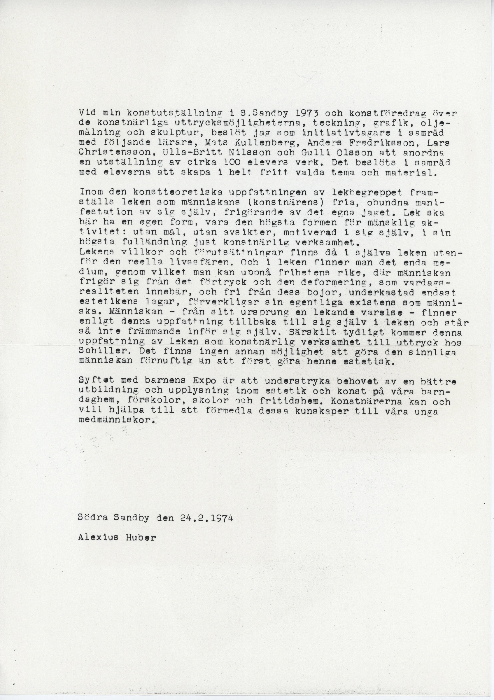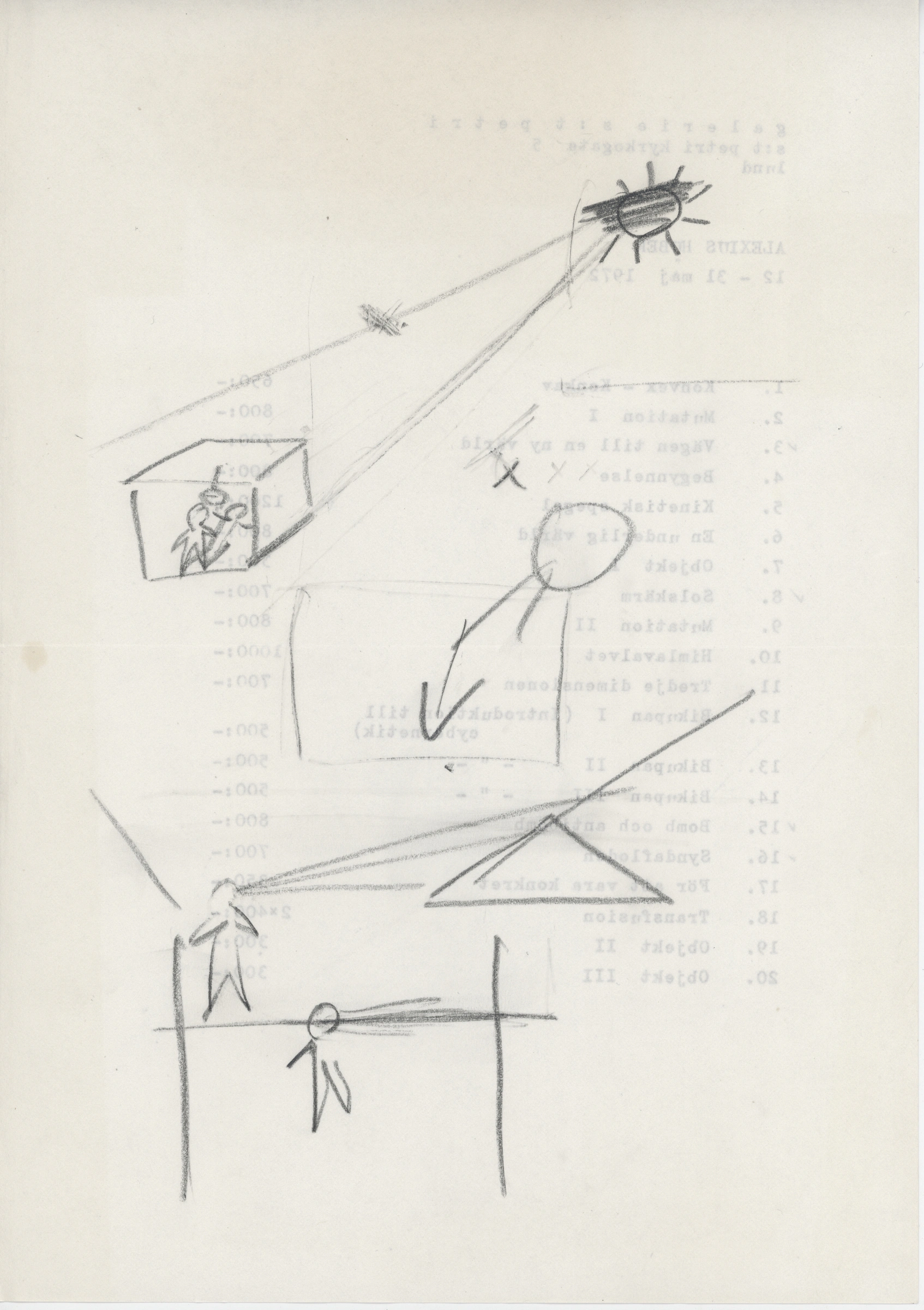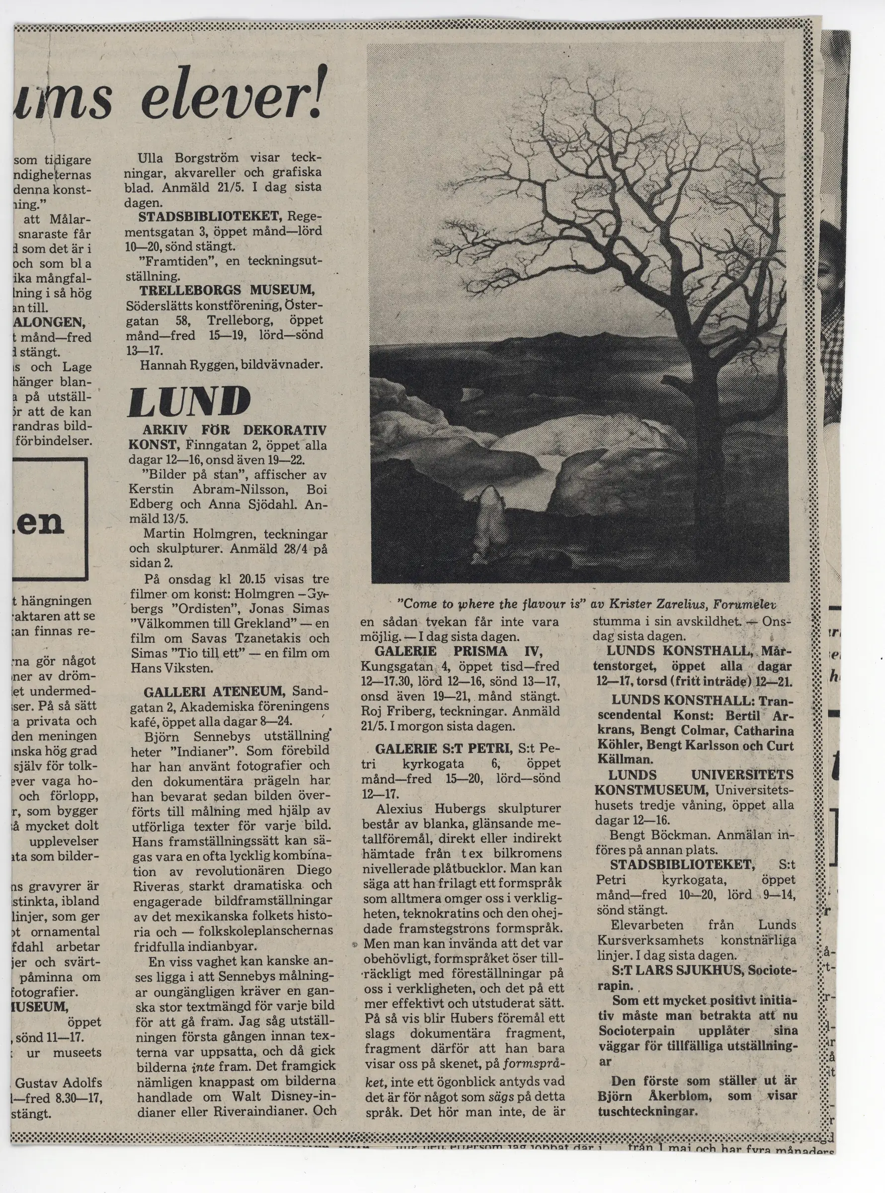 [JEANSELLEM VIEWER] — 21.04 - 10.05.1972 ALEXIUS HUBER — Categories: invitation, press — Keywords: Galerie S:t Petri, Jean Sellem, archive — Category: invitation — Galerie S:t Petri is holding an opening today, Friday, for an exhibition of sculptures by Alexius Huber. He creates his objects from aluminum, brass, plexiglass and electric lamps, and is fascinated by the reflections of light in dents and indentations. The opening runs from 5–8 pm. The exhibition continues until 31 May. — — — Alexius Huber at Galerie S:t PetriLUND: The exhibiting artist for the month of May at Galerie S:t Petri in Lund is Alexius Huber. Huber, who is 33 and a sculptor, will show his works at S:t Petri from 12 May until 31 May.About him, Jean Bolinder writes, among other things: Huber has created his objects from aluminium, brass, plexiglass and electric lamps. He has been fascinated by the sheen of metal, by light’s reflections in dents and incisions, and by the artificial patterns created by rotating plexiglass discs.Huber wants to teach us to see the beauty in the world around us. At the same time, he awakens in us an awareness of our growing emptiness—everything we are in the process of losing: fresh air, living soil, clear water, humanity, community.Galerie S:t Petri, S:t Petri Kyrkogatan 5, Lund, is open weekdays from 15:00 to 20:00, and Saturdays and Sundays from 12:00 to 17:00. — — — Category: invitation — Alexius Huber at S:t PetriGalerie S:t Petri in Lund held an opening on Friday for an exhibition by Alexius Huber. Huber has created his sculptures from aluminium, brass, plexiglass and electric lamps. — — — Caption: “Come to where the flavour is”, by Krister Zarelius (Formuleter). — LUND — GALERIE S:T PETRI (S:t Petri kyrkogata 6)Open Mon–Fri 3–8 pm, Sat–Sun 12–5 pm.Alexius Huber’s sculptures consist of smooth, gleaming metal objects, directly or indirectly drawn, for example, from the levelled sheet-metal dents of car chrome. One might say he has uncovered a formal language that increasingly surrounds us in reality: the language of technocracy and unrestrained faith in progress.But one might object that this is unnecessary: in real life that formal language already pours enough notions over us—and in a more effective, more calculated way. In that sense Huber’s objects become a kind of documentary fragments; fragments because he shows us only the sheen, the formal language—without for a moment suggesting what it is that is being “said” in that language. You don’t hear it; they are mute in their seclusion. — Wednesday is the last day. — — — Category: press — “Portrait of a Native American Chief,” by Björn Senneby. — Indians, posters, abstractionsThe original population of North America was the Indians; they were pushed out and very quickly became a hunted minority in conflict with the colonizers. The Indians never mixed with the new inhabitants but preserved their ethnic distinctiveness, even though this came at the price of living in reservations under harsh oppression. Ideas of independence existed among the Indians but can be said to have died definitively with Sitting Bull, one of the most legendary Native American chiefs. These chiefs have been portrayed by Björn Senneby in simple frontal images, somewhat stiff, resembling the old photographs that likely served as his models. These portraits do not speak directly about Indians, but they reflect their myth while serving as apotheoses of a people and its struggle against the imperialist colonizers who drove them from their lands. The struggle of the Indians was the same as that of the national liberation fronts around the world today.THE EXHIBITION *Bilder på stan* (“Pictures in the City”) is also called *Alternative Advertising* and was created in collaboration between three artists: Kerstin Abram-Nilsson, Boj Edberg and Anna Sjödahl. Together they make posters addressing various social problems, pointing out abuses and urging the viewer to take a stand. Their advertising differs from commercial advertising, which tries to overcome the consumer’s resistance to buying, whereas this alternative advertising wants to make people reflect on their present and future situations, about issues such as environmental destruction. Their posters are displayed in the same way as commercial ones: they are posted on rented billboards in Stockholm, and in that setting their contrast with regular advertising becomes evident. Such posters are fairly easy to make, as the artists explain in detail in the exhibition catalogue. In this way everyone who can finance a billboard slot can have a voice. Sometimes the artists have paid for the posters themselves, other times with the help of grants. As professional artists, none of them can make a living from such posters, since they are not intended to be bought or sold.MUCH of the art shown in galleries lacks the concreteness that the images mentioned above possess. Huber works in a general modernist tradition but is often vaguer than general and leaves a rather flat impression. In Alexius Huber’s gleaming metallic works and mobile optical objects, the content is reduced to form and rhythm, with abstraction itself remaining. It is a series of objects that can be interpreted entirely according to the viewer’s will, as the artist seems to have renounced all responsibility for content. What remains is a kind of decorative craft.The American graphic artist Anne Walker is also vague and general, but in a somewhat different way. Her decorative posters depict various things — fragments of vegetation. Yet one cannot recognize specific species of plants or trees: everything is abstracted into decorative concepts.HANS JOHANSSONGALLERI ATHENEUM, Lund: Björn Senneby ARKIVMUSEET, Lund: *Bilder på stan* GALLERIE S:T PETRI, Lund: Alexius Huber GALERIE LEGER, Malmö: Anne Walker — — — “The artists among their works: Jan Hansson on th