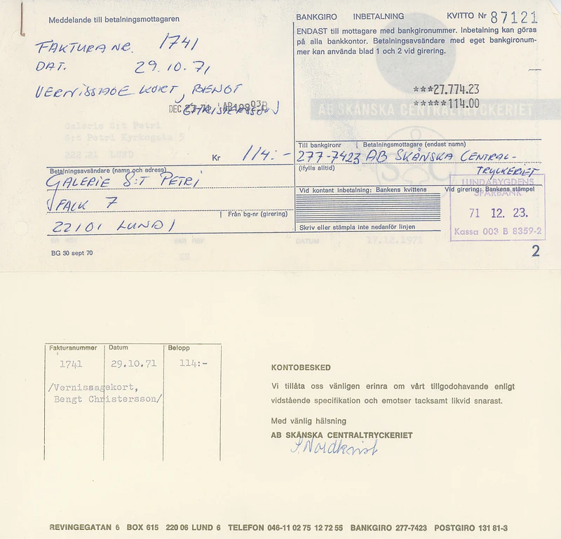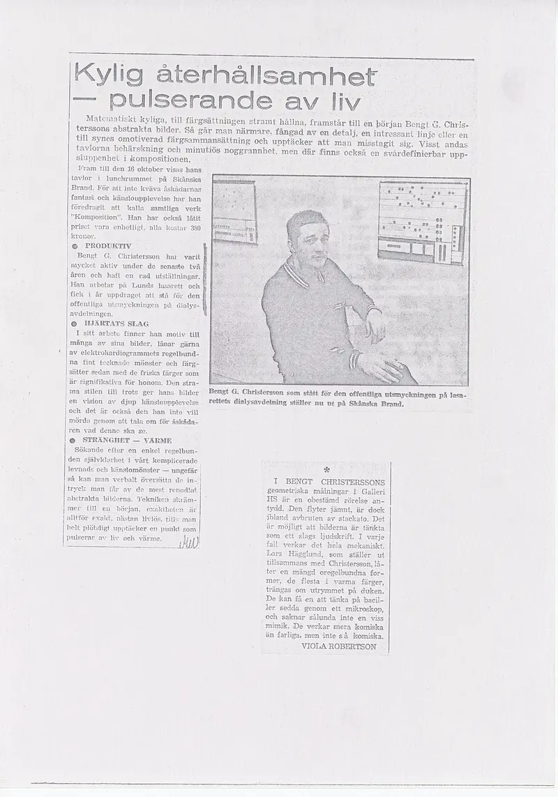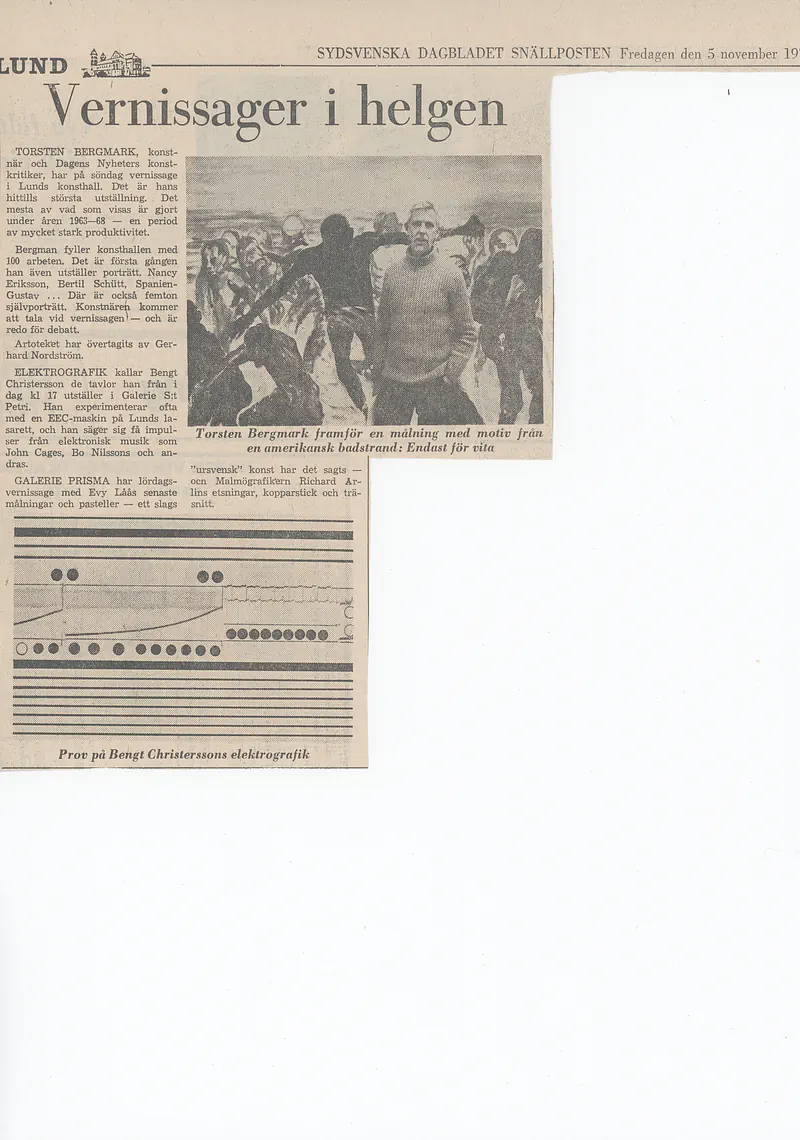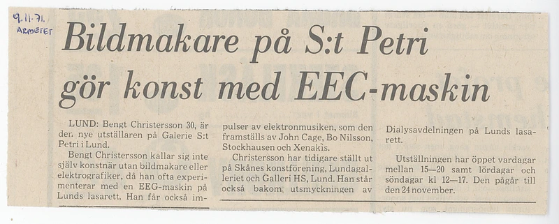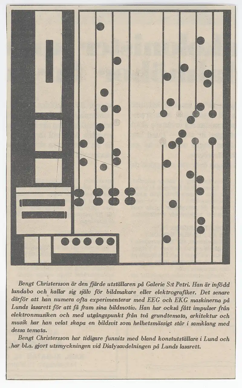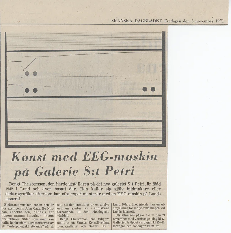 [JEANSELLEM VIEWER] — 05.11-24.11.1971 BENGT CHRISTERSSON — Categories: press, docs, visual, letters — Keywords: Galerie S:t Petri, Jean Sellem, archive — Category: press — Bengt Christersson is the fourth exhibitor at Galerie Petri. He is a native of Lund and refers to himself as an image maker or electrographic artist. The latter because he often experiments with EEG and EKG machines at Lund Hospital to create his visual motifs.He has also drawn inspiration from electronic music, and based on two fundamental themes — architecture and music — he has aimed to create a series of images that harmoniously resonate with these themes.Bengt Christersson has previously participated in art exhibitions in Lund and has, among other projects, created the decorations for the Dialysis Department at Lund Hospital. — — — Category: press — Image maker at S:t Petri creates art with EEG machineLUND: Bengt Christersson, 30, is the new exhibitor at Galerie S:t Petri in Lund. Bengt Christersson does not refer to himself as an artist but rather as an image maker or electrographer, as he often experiments with an EEG machine at Lund Hospital. He also draws inspiration from electronic music, as produced by John Cage, Bo Nilsson, Stockhausen, and Xenakis.Christersson has previously exhibited at Skåne Art Association, Lundagalleriet, and Galleri HS in Lund. He is also responsible for the decoration of the Dialysis Department at Lund Hospital.The exhibition is open on weekdays from 3 PM to 8 PM, as well as on Saturdays and Sundays from 12 PM to 5 PM. It runs until November 24th. — — — Category: press — Art with EEG Machine at Galerie S:t PetriBengt Christersson, the fourth exhibitor at the new gallery S:t Petri, was born in 1942 in Lund, where he also resides. He refers to himself as an image maker or electrographer, as he often experiments with an EEG machine at Lund Hospital.Electronic music, as seen in the works of John Cage, Bo Nilsson, Stockhausen, and Xenakis, provides him with many impulses, as does architecture. The style that can be called concretism is characterized by an “anthropological quest” in that it serves both as an analysis and a synthesis of humanity’s relationship with the technological world.Bengt Christersson has previously exhibited at Skånes Konstförening, Lundagalleriet, and Galleri HS in Lund. Last year, he created a decoration for the dialysis department at Lund Hospital.The exhibition runs until November 24, with an opening today at 5 PM. The gallery is open on weekdays from 3 PM to 8 PM, and on Saturdays and Sundays from 12 PM to 5 PM. — — — Category: press — Bengt Christersson calls the paintings he will exhibit today at 5 PM in Galerie S:t Petri “electrografik.” He often experiments with an EEG machine at Lund’s hospital, claiming to draw inspiration from electronic music such as that of John Cage, Bo Nilsson, and others. — — — Category: press — If one wants to communicate something, to express something, it is done in a specific way, in a specific form, using certain conventional signs. This applies, of course, to all messages, including artistic ones.Bengt Christersson limits himself in his images to only talking about language — that is, essentially about nothing. They are beautiful images, virtuosic compositions that speak about the act of speaking, discussing the signs used to communicate, to convey messages. They are breathtaking abstractions. — — — Category: docs — Cool Restraint – Pulsating with LifeMathematically cool, with strictly maintained color compositions, Bengt G. Christersson’s abstract works initially appear distant. But as one gets closer, captivated by a detail, an intriguing line, or an apparently neutral combination of colors, one discovers a world of nuances and meticulous precision that invites a closer look. His works, with their rigor in composition, also convey a certain indefinable lightness.Until October 16, his works are on display in the “Lunchrumet” at Skånska Brand. To avoid confusing art enthusiasts, he has chosen to name all his works “Composition.” Each piece is light and reasonably priced, around 380 kronor.PRODUCTIVITYBengt G. Christersson has been very active over the past two years. His works are displayed not only in Lund but also nationally, primarily thanks to a commission for murals in the regional hospital’s dialysis department.HEARTBEATSChristersson attracts many new admirers through his works, which embody a meticulous search for rhythms and sensory patterns. One senses a profound feeling of contemplation, inviting the viewer to ponder the meaning behind these works.STRAIGHTNESS – WARMTHThe viewer, initially confronted with a sort of rigorous and complex logic, eventually discovers a point where the rhythm of life and warmth seems to subtly pulse beneath the surface.In Bengt Christersson’s geometric paintingsAt Gallery HS, there is an indefinable movement. The flow is sometimes steady, but occasionally staccato. The works appear to be a sort of mechanical play of light.Lars Hägglund, exhibiting with Christersson, brings a certain depth that contrasts with the humorous, microscopic aspect of some of Christersson’s pieces, which seem almost more comical than menacing.Viola Robertson — — — Category: docs — At Lunda Galleriet, Beng G. Christensson makes his debut with a rather interesting collection of ink drawings—some of which might even be considered paintings. The exhibition is divided into two sections, each featuring a collage as a “sign.” One section includes an anatomical model of a male body, while the other showcases an eye, through which the artist’s otherwise abstract images gain a human connection, anchoring them in sensory experiences.The first part of the exhibition contains concrete exercises, where Christensson’s unique style is difficult to discern, while the second part, which deals with certain optical phenomen