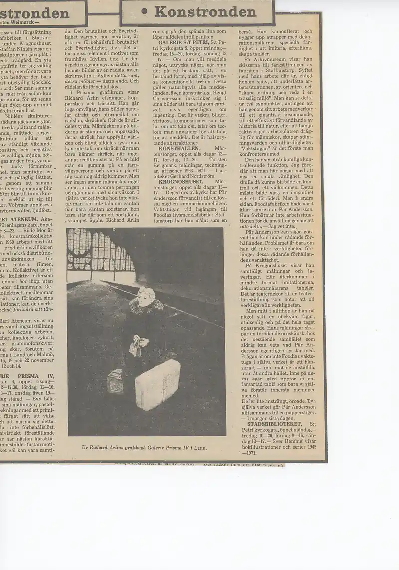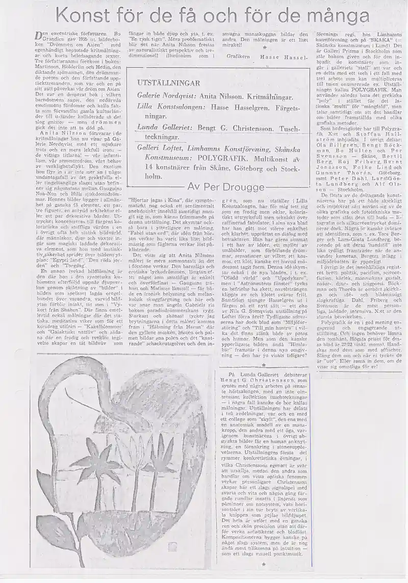 Exhibitions: 1968 – Skåne Art Association 1969 – Lundagalleriet 1969 – Gallery HS, Lund