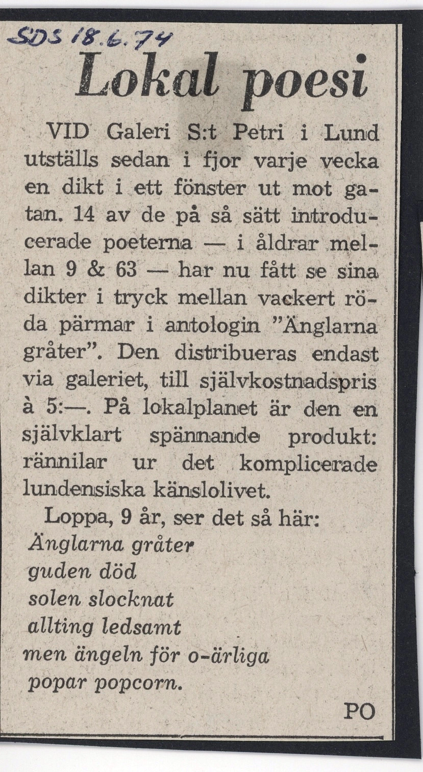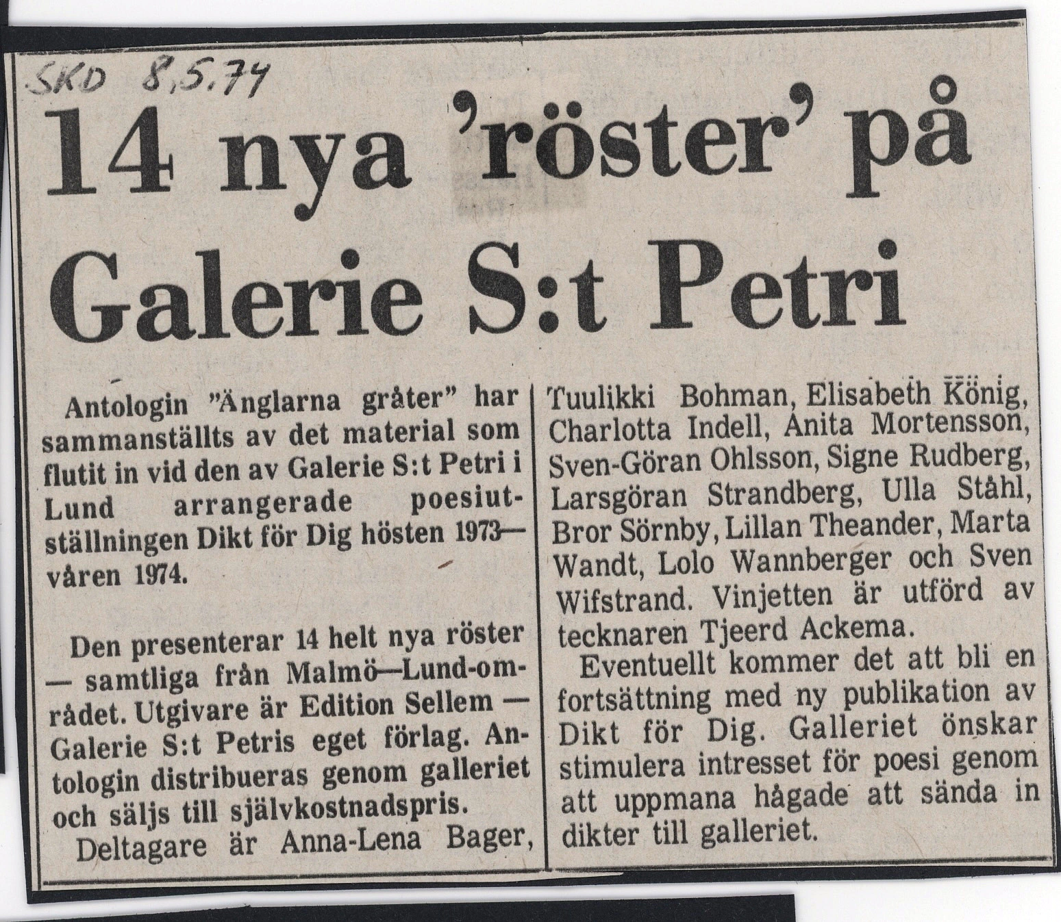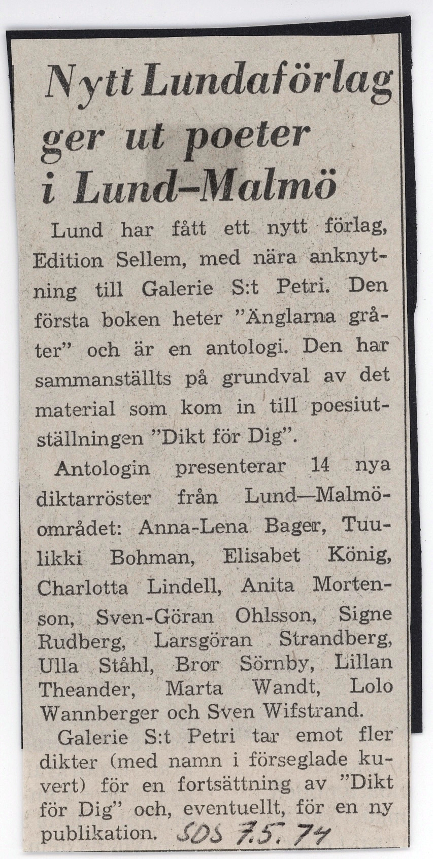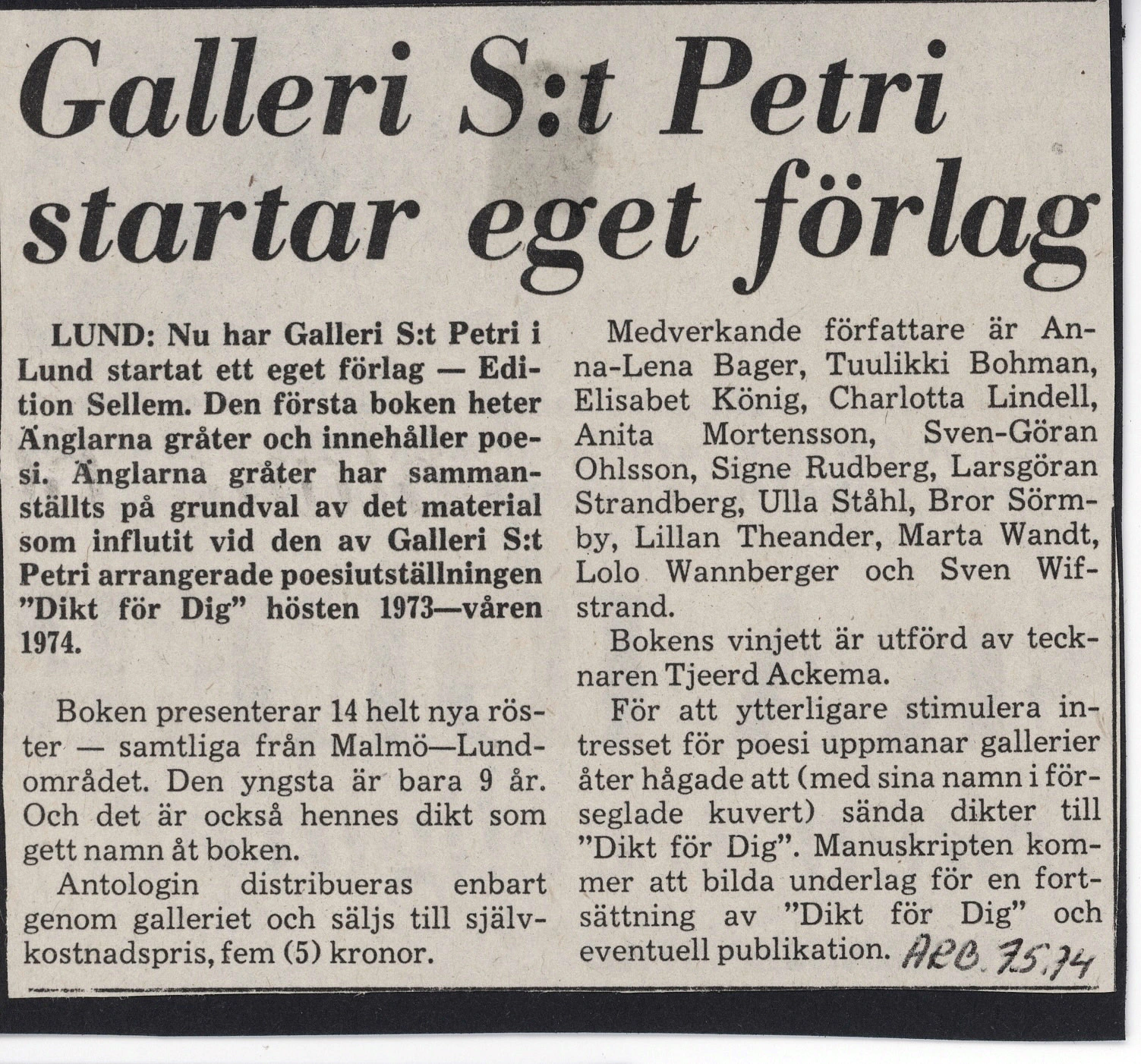 [JEANSELLEM VIEWER] — FALL 73 TO SPRING 74 DIKT FÖR DIG — Categories: press, docs — Keywords: Galerie S:t Petri, Jean Sellem, archive — Category: press — Newspaper unidentified (handwritten pen annotation: “20.3.74”) — Press article announcing the launch of Edition Sellem, the publishing initiative of Gallery S:t Petri. The article introduces the poetry anthology “Änglarna gråter”, derived from the exhibition “Dikt för Dig” (1973–1974) — Gallery S:t Petri launches its own publishing houseIn Lund, Gallery S:t Petri has now launched its own publishing house, Edition Sellem. The first book is entitled The Angels Weep and contains poetry. The Angels Weep has been compiled on the basis of material collected during the poetry exhibition “Poem for You”, organized by Gallery S:t Petri in the autumn of 1973 and the spring of 1974.The book presents fourteen entirely new voices, all from the Malmö–Lund region. The youngest contributor is only nine years old, and it is also her poem that gave the book its title.The anthology is distributed exclusively through the gallery and sold at cost price, five (5) kronor. Participating authors are Anna-Lena Bager, Tuulikki Bohman, Elisabet König, Charlotta Lindell, Anita Mortensson, Sven-Göran Ohlsson, Signe Rudberg, Larsgöran Strandberg, Ulla Ståhl, Bror Sörmby, Lillan Theander, Marta Wandt, Lolo Wannberger, and Sven Wifstrand. The book’s vignette was created by illustrator Tjeerd Ackema.To further stimulate interest in poetry, the gallery encourages interested individuals to send poems to “Poem for You”, with their names enclosed in sealed envelopes. The manuscripts will form the basis for a continuation of “Poem for You” and a possible publication. — — — Category: press — New Lund-based publishing house releases poets in Lund–MalmöLund has gained a new publishing house, Edition Sellem, closely connected to Gallery S:t Petri. The first book is entitled The Angels Weep and is an anthology. It has been compiled on the basis of material submitted to the poetry exhibition “Poem for You”.The anthology presents fourteen new poetic voices from the Lund–Malmö region: Anna-Lena Bager, Tuulikki Bohman, Elisabet König, Charlotta Lindell, Anita Mortensson, Sven-Göran Ohlsson, Signe Rudberg, Larsgöran Strandberg, Ulla Ståhl, Bror Sörmby, Lillan Theander, Marta Wandt, Lolo Wannberger, and Sven Wifstrand.Gallery S:t Petri also accepts further poems, with names enclosed in sealed envelopes, for a continuation of “Poem for You” and possibly for a new publication — — — Category: press — Sydsvenska Dagbladet, 7 May 1974 (handwritten pencil annotation: “SDS 7.5.74”). Press article announcing the founding of Edition Sellem in Lund, closely linked to Gallery S:t Petri. The article introduces the poetry anthology “Änglarna gråter”, originating from the exhibition “Dikt för Dig”, and calls for further submissions for future publications. — — — Category: press — Skånska Dagbladet, 8 May 1974 (handwritten pencil annotation: “SKD 8.5.74”) — Press article on the poetry anthology “Änglarna gråter”, published by Edition Sellem, Gallery S:t Petri’s publishing initiative. — 14 new “voices” at Gallery S:t PetriThe anthology The Angels Weep has been compiled from material submitted to the poetry exhibition “Poem for You”, organized by Gallery S:t Petri in Lund during the autumn of 1973 and the spring of 1974.It presents fourteen entirely new voices, all from the Malmö–Lund region. The publisher is Edition Sellem, Gallery S:t Petri’s own publishing house. The anthology is distributed through the gallery and sold at cost price.Participating authors are Anna-Lena Bager, Tuulikki Bohman, Elisabeth König, Charlotta Indell, Anita Mortensson, Sven-Göran Ohlsson, Signe Rudberg, Larsgöran Strandberg, Ulla Ståhl, Bror Sörmby, Lillan Theander, Marta Wandt, Lolo Wannberger, and Sven Wifstrand. The vignette was created by illustrator Tjeerd Ackema.A continuation of “Poem for You” in the form of a new publication is being considered. The gallery aims to stimulate interest in poetry by encouraging submissions. — — — Category: press — Kvällsposten, 17 August 1974 (handwritten pencil annotation: “KD 17.8.74”). Review article on the poetry anthology “Änglarna gråter”, published by Edition Sellem (Gallery S:t Petri, Lund). — Sincere but scarcely adventurous poetryGallery S:t Petri in Lund carries out commendable promotional work for poetry. In the autumn of 1973 and the spring of 1974, the idea-driven and enterprising gallery organized the exhibition “Poem for You”. Among the poems that streamed in to this kind of beginners’ fair for lyric poetry, a smaller number has now been selected and presented in a tastefully designed collection.“The Angels Weep” is the title of nine-year-old Charlotta Lindell’s contribution, and it also gives its name to the entire book. Besides Charlotta, thirteen other debuting poets from the Scania region participate. All write poetry that is easy to grasp, restrained, sincere, but scarcely adventurous. Their imagery is no bolder than that of most of their colleagues; like a majority of twentieth-century poets, they express their thoughts and feelings in unrhymed free verse.These lyrical beginners are, surprisingly, disengaged from social issues. Almost all occupy themselves with strictly personal problems, speaking of loneliness and isolation and of a longing for human contact.You will not regret ordering “The Angels Weep” from Gallery S:t Petri in Lund. The beautiful book costs only five kronor and offers a chance to become acquainted with promising debutants who, in a few years’ time, may develop into truly significant poets.(Read by librarian Göran Källquist, Malmö.) — — — Category: docs — Gallery S:t Petri, Lund. Typewritten informational text issued by Gallery S:t Petri announcing