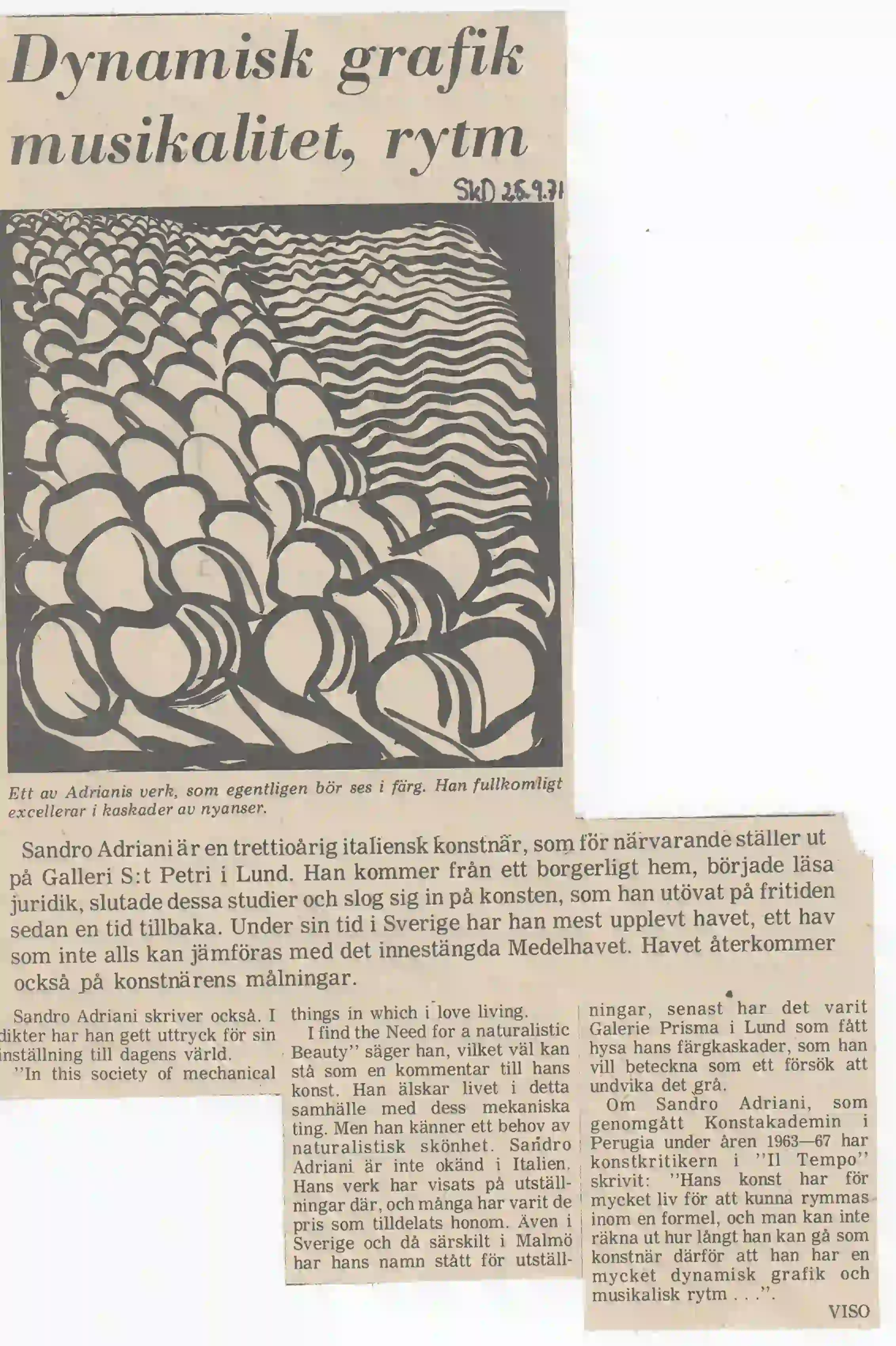 [JEANSELLEM VIEWER] — 24.09 - 13.10.1971 SANDRO ADRIANI — Categories: press, visual, docs — Keywords: Galerie S:t Petri, Jean Sellem, archive — Category: press — — — Category: press — SANDRO ADRIANI, exhibiting at Galerie S:t Petri, likes to paint a schematic landscape with a similarly schematic sky above it. The waves have frozen in their motion and resemble corrugated metal sheets. The coloration is also simple: unmixed blue, yellow, green, and red. The effect can be strong enough for the retina to react. — — — Category: press — GALLERY S:T PETRI, S:t Petri Kyrkogata 5, open Monday–Friday 3 PM–8 PM, Saturday–Sunday 12 PM–5 PM. Adriani’s paintings and drawings also belong to a geometric and abstract idiom. Decorative motifs with precise forms, in strong colors, built from pure, vivid color fields — LAST DAY ON WEDNESDAY. — — — Category: press — GALLERY S:T PETRI, S:t Petri Kyrkogata 5, open Monday–Friday 3 PM–8 PM, Saturday–Sunday 12 PM–5 PM. — Sandro Adriani, paintings and graphic works. — — — Category: press — Dynamic Graphics – Musicality, RhythmOne of Adriani’s works, which really ought to be seen in color. He excels completely in cascades of nuances.Sandro Adriani is a thirty-year-old Italian artist, currently exhibiting at Galleri S:t Petri in Lund. He comes from a middle-class family, began studying law, then abandoned those studies to pursue art, which he had been practicing in his spare time for some years. During his stay in Sweden, he has experienced the sea more than anything else — a sea that cannot be compared to the enclosed Mediterranean. The sea also reappears in the artist’s paintings.Sandro Adriani also writes. In his poems, he expresses his attitude toward today’s world. “In this society of mechanical things in which I love living, I find the Need for a naturalistic Beauty,” he says — a line that may well serve as a commentary on his art. He loves life in this society with its mechanical things. Yet he feels a need for naturalistic beauty.Sandro Adriani is not unknown in Italy. His works have been shown in exhibitions there, and he has received many prizes. In Sweden too — especially in Malmö — his name has been associated with exhibitions. Most recently, Galerie Prisma in Lund hosted his cascades of color, which he describes as an attempt to avoid the gray.About Sandro Adriani, who studied at the Art Academy in Perugia between 1963 and 1967, an art critic for Tempo wrote: “His art has too much life to be confined within a formal structure, and it is impossible to predict how far he may go as an artist, for his work is marked by a very dynamic, graphic and musical rhythm…” — — — Category: press — Italian Artist at S:t PetriLUND: The newly founded S:t Petri Gallery in Lund is holding the opening today for an exhibition by the Italian artist Sandro Adriani.Adriani comes from Foligno in Italy, where he studied law for several years after graduating, before switching to art studies in 1963. He moved to Sweden in 1968.In addition to several exhibitions in Italy, Adriani has shown his work at Göteborgs Bank in Malmö, Galleri Prisma in Lund, and the Arbetet art club in Malmö. — — — Category: visual — — — Category: docs — Sandro AdrianiIn the presence of Sandro Adriani’s painting, one is reminded of how deep the roots of modern abstract art truly are. What feels fresh and new in his canvases is, paradoxically, precisely what is old. He remains largely untouched by what currently dominates contemporary art, instead linking himself to a tradition directly connected to the origins of modern abstract art — the heroic breakthrough years just before and during the First World War.This starting point for a young artist is surprising, yet entirely natural: his teacher was the now grey-haired Italian artist Gerardo Dottori, a member of the Futurist circle and close friend of Severini, Balla, and other figures well known in Sweden for their role in the emergence of Italian modernism and their signatures on the famous manifestos.It is surely through Dottori’s teachings that Adriani has been able to reconnect, in such a direct way, with the early 20th-century efforts — inspired by pioneers such as Monet, van Gogh, and Signac — to create a colourist painting in which impressions of nature were abstracted to the point of near non-figuration. Some of Adriani’s earlier canvases in this exhibition are landscape impressions built as colourist compositions of lyrically shimmering pure colour touches, applied with a broad brush, with close affinities to certain divisionist, fragmented works by Derain, Vlaminck, and Braque from the Fauvist years 1905–07.But Adriani has not been content merely to reconnect with an early abstract tradition: he is a boldly exploratory artist who, in the few years he has been active, has developed a highly personal abstract style, marked by an unusually lyrical sense of colour. In his most recent canvases, he moves beyond this manner toward a visual language in which elements of nature reappear — abstracted into large, unified magical figures.Knut Andersson
